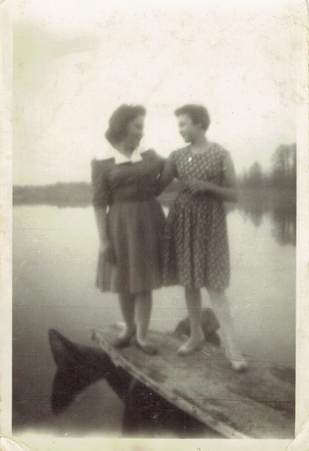 Janina Chmielewska z koleżanką, na pomoście nad jeziorem Blizno w Atenach.