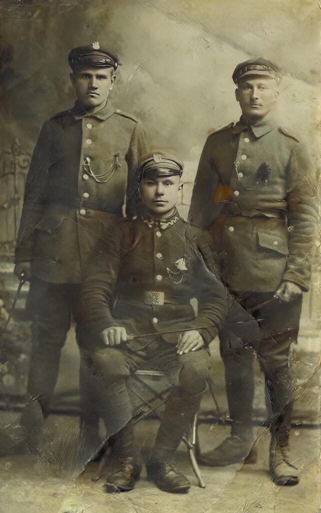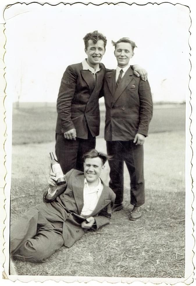 Bronisław Chmielewski z kolegami, wspólne ujęcie dokumentujące codzienność dawnych lat. Zdjęcie