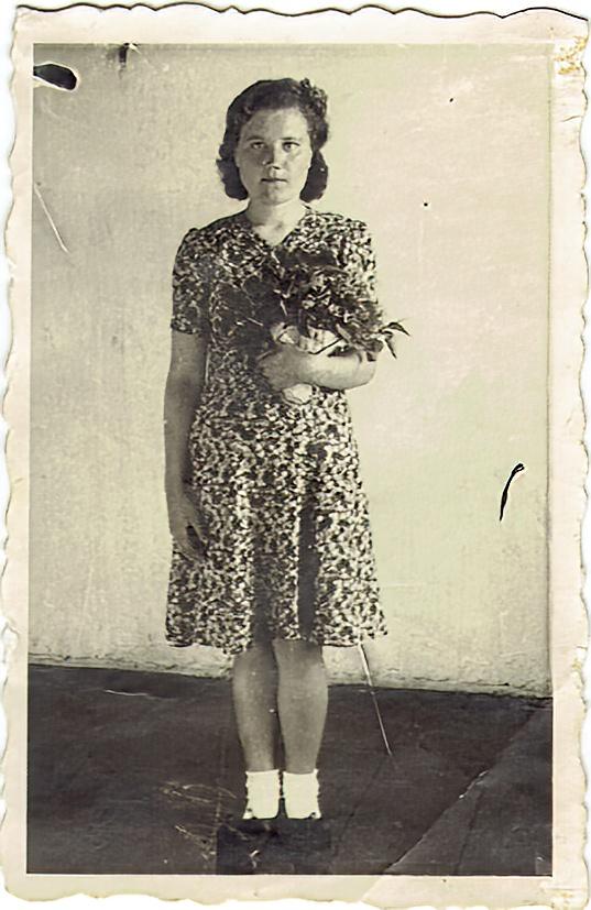młodą dziewczynę w kwiecistej sukience, trzymającą bukiet kwiatów. Zdjęcie zachowało się jako pamiątka rodzinnej historii i młodości spędzonej w Atenach.