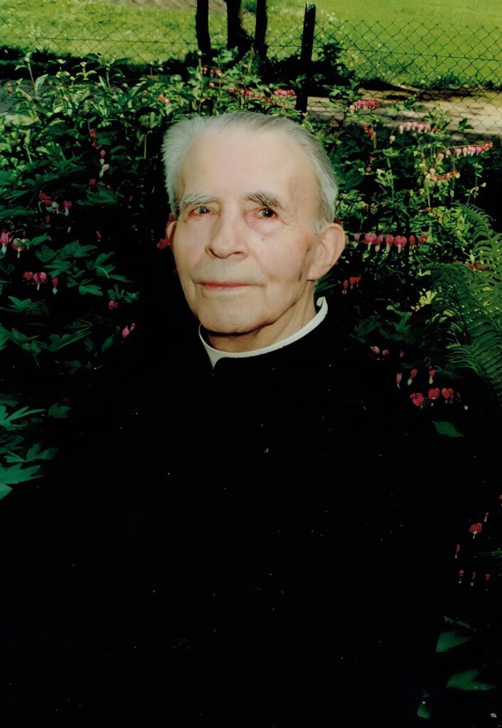 o Zdjęcie pokazujące księdza w późnym wieku w otoczeniu przyrody w Monkiniach.
